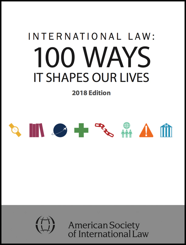 The "100 Ways" project was conceived from the proposition that international law not only exists but also penetrates more deeply and broadly into everyday life than is generally recognized. One-hundred examples of this fact were identified by ASIL members, vetted by a small group of experts, and organized into seven chapters: daily life, leisure, travel, commerce, health and the environment, personal liberty, and public safety and security. This list has proved a useful education tool for non-expert audiences, from students and the public to judges and policymakers. The resource is free to download in PDF form , and reproduction for educational purposes with due acknowledgement is permitted.